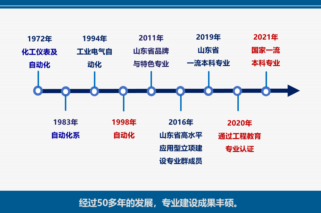 成立较早的5个本科专业之一。1983年成立自动化系,1994年增设工业电气自动化专业。1998年将生产过程自动化、工业电气自动化“并轨”,更名为自动化专业,形成了工业自动化和电气自动化的专业特色。自动化专业2010年获批一级学科硕士点,2011年获省品牌特色专业,2016年入选山东省高水平应用型立项专业群,2019年入选省级一流本科专业建设点,2020年通过工程教育专业认证,2021年入选国家一流本科专业建设点。