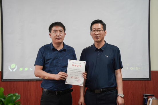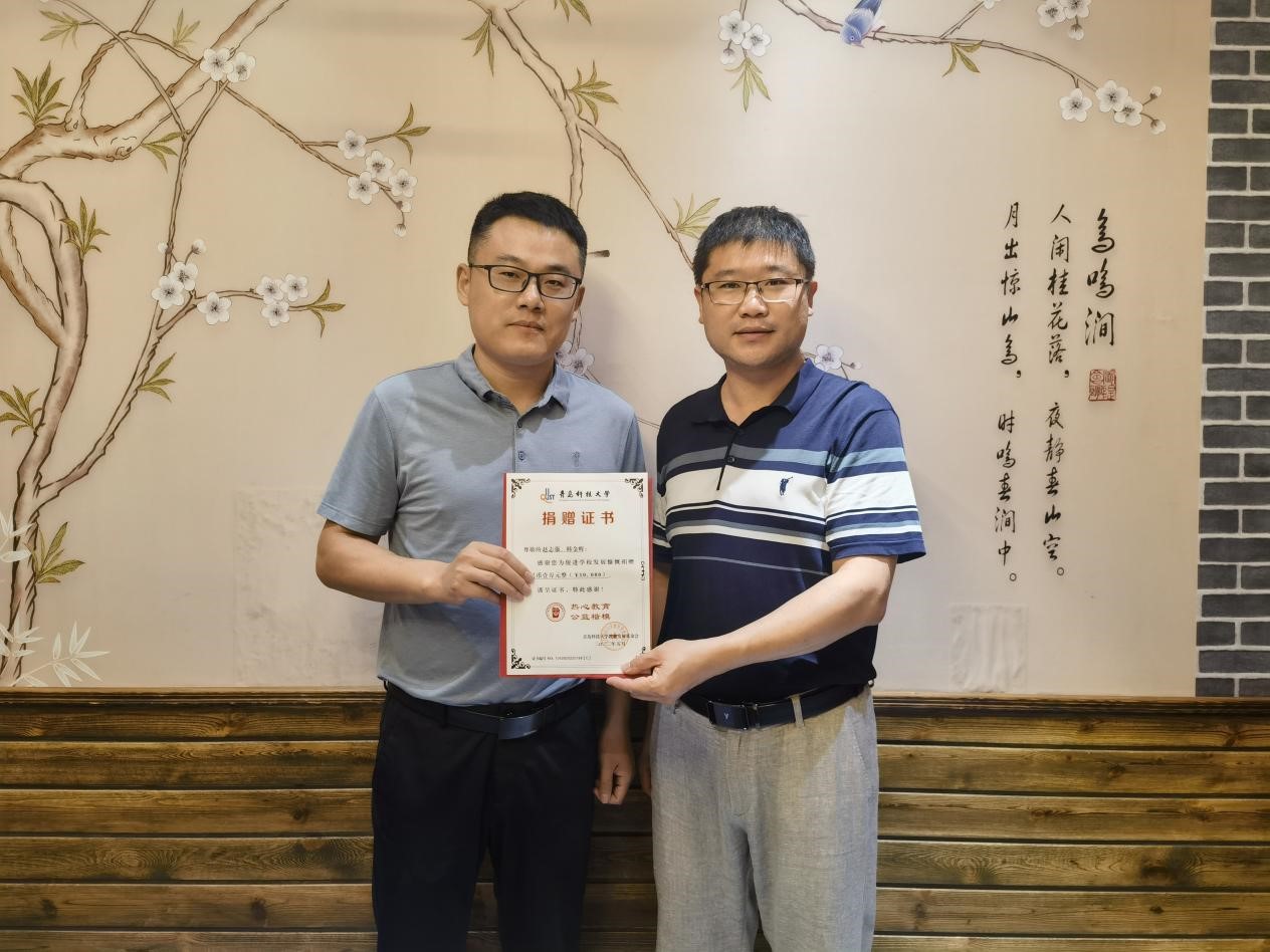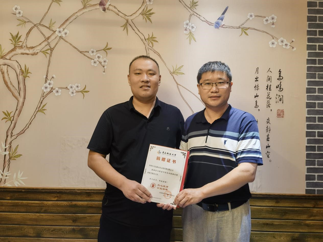 马寒为韩兵校友颁发捐赠证书并代表学院对其表示衷心的感谢。他表示,一代代“自家人”久久为功、只争朝夕,学院每一步前进都离不开广大校友的关心与支持,他欢迎校友们继续关注母校,有时间常回家看看,齐心协力,共谋发展。