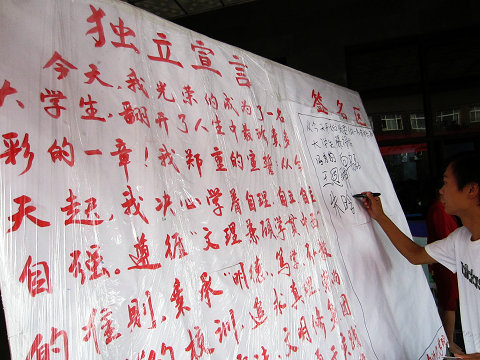 的迎新点入口处,有一块醒目的展板,上面印着新生的独立宣言书:“今天,我光荣的成为了一名大学生,翻开了人生最珍贵多彩的一章!我郑重的宣誓:从今天起,我决心学着自理,自立,自主,自强,遵循“文理兼顾,学贯中西”的准则,秉承‘明德,笃学,弘毅,拓新’的校训,追求真理,崇尚科学,遵纪守法,文明修身,团结友爱,勤奋学习,勇于实践,立志成长,誓言做社会主义事业的建设者和接班人,为中华民族的伟大复兴贡献自己的力量!”每一位新生都在独立宣言书上签名,每一笔认真的签名,都透露着他们坚定的决心和满满的信心,透露着他们对未来的展望和期待。家长们都在学院特别开设的休息区休息,新生们在志愿者的引导下独自完成所有的报到程序。在入学第一天加强大学新生独立意识的培养,教育引导学生学会独立生活,学会感恩父母,学会规划未来,学会感知社会。