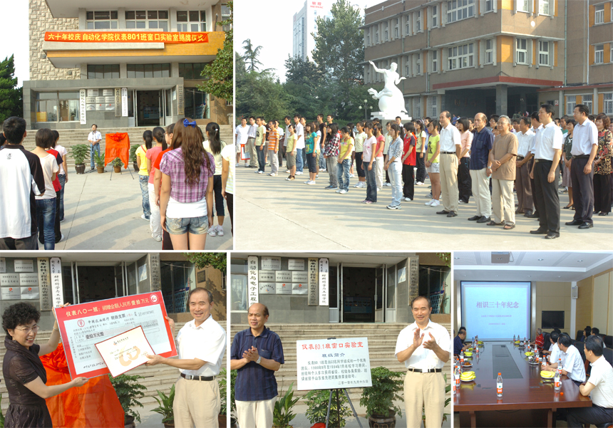 首任院长邬齐斌老师共同为仪表80.1班窗口实验室揭牌。揭牌仪式结束后学校领导与仪表80.1班师生共同合影留念。
