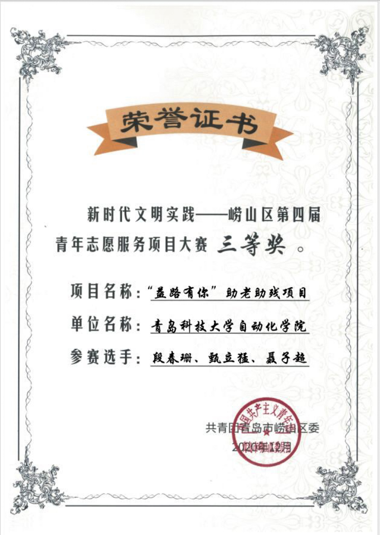 “益路有你”助老助残公益项目荣获崂山区第四届青年志愿服务项目大赛三等奖。