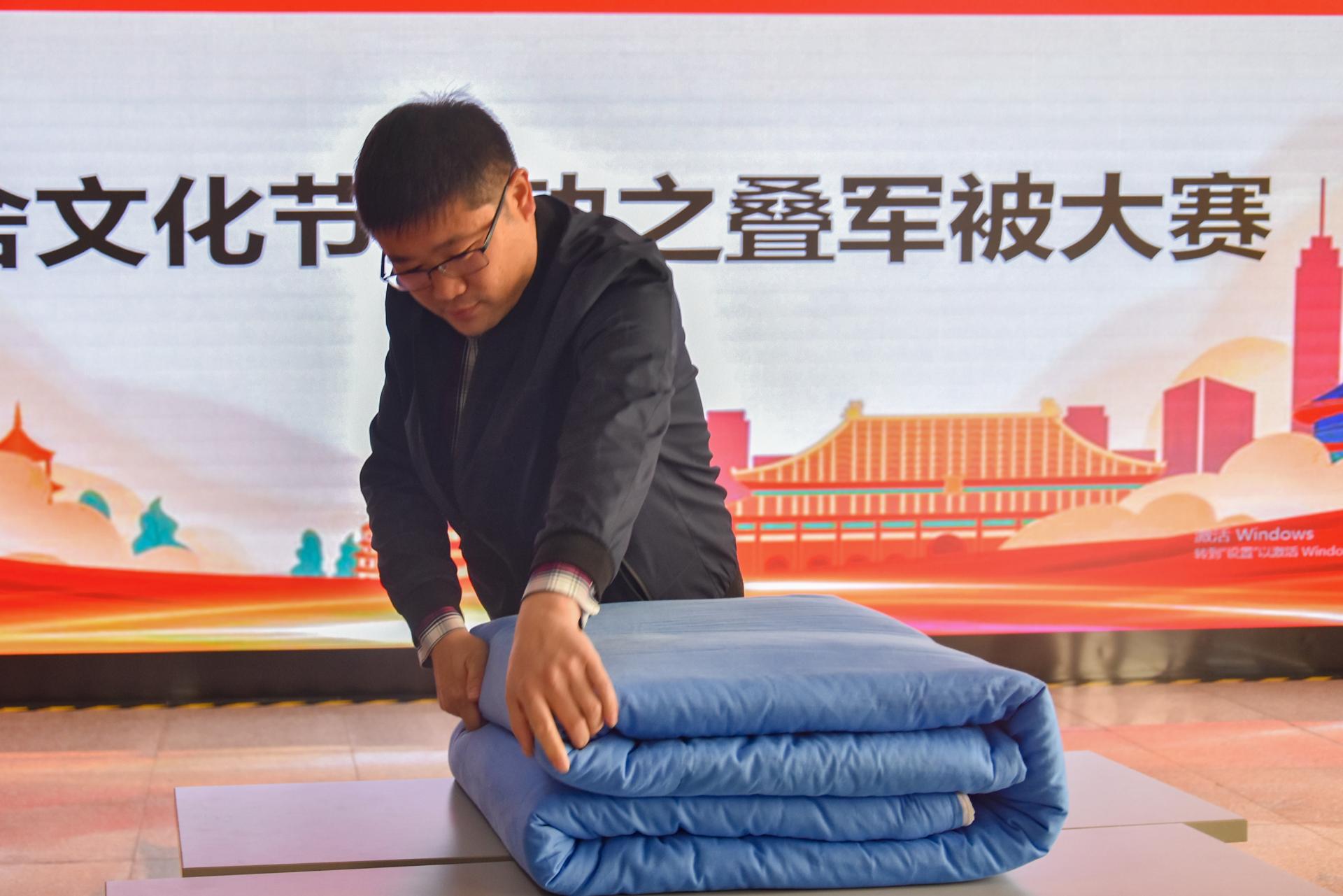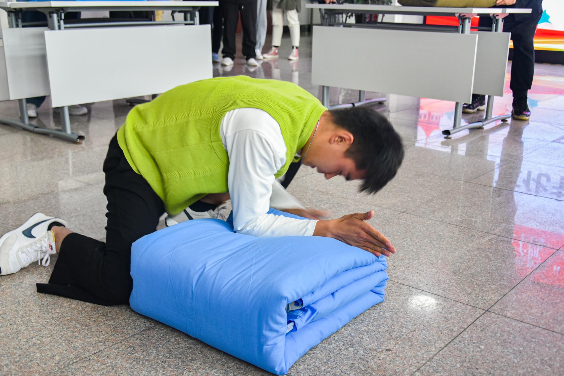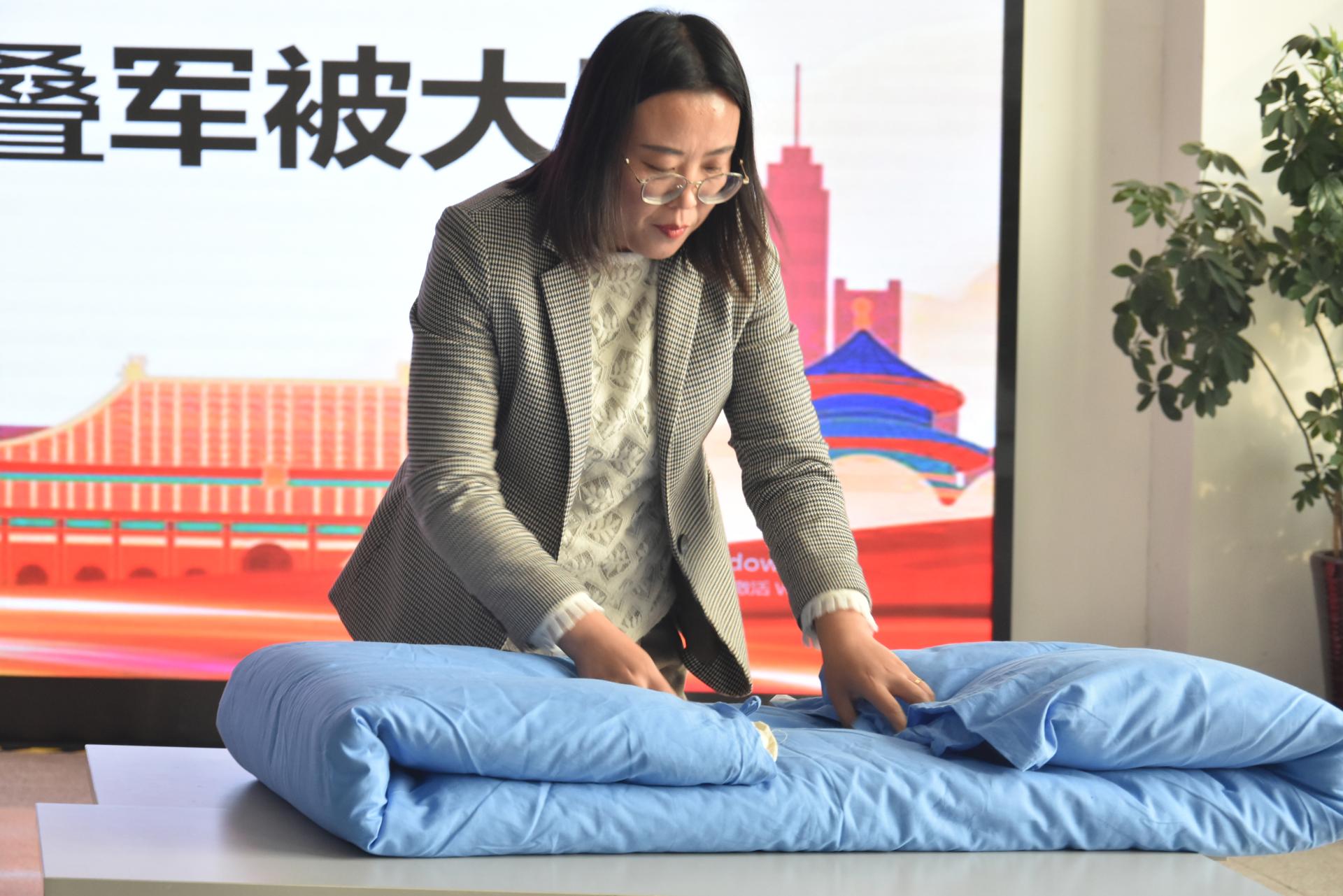 本次叠军被大赛是宿舍文化节的首个活动,比赛伊始,学院五位老师率先上场,给在场同学做示范,翻叠、折角、压线,循序渐进,老师们的军被成品得到评委们的高度肯定。