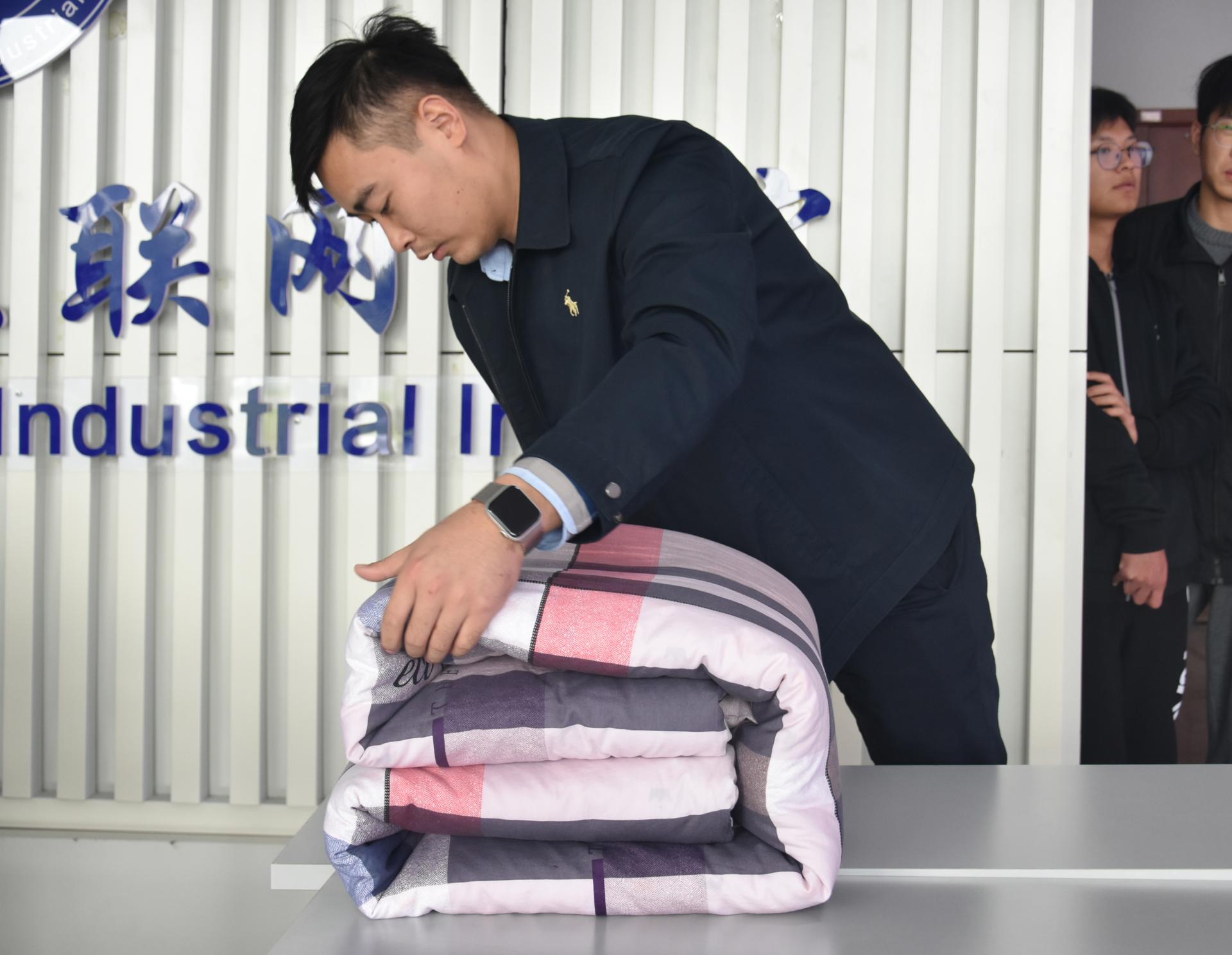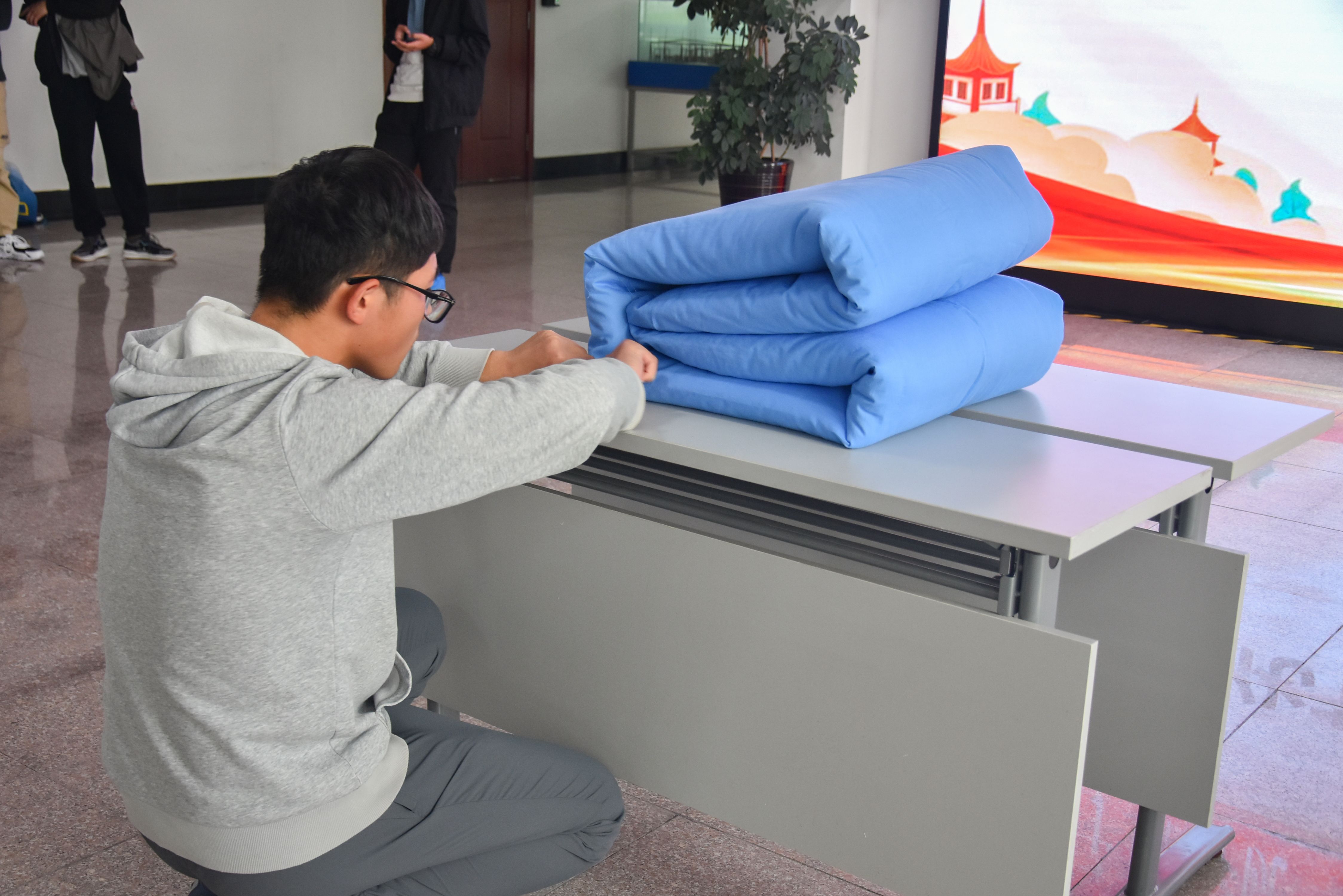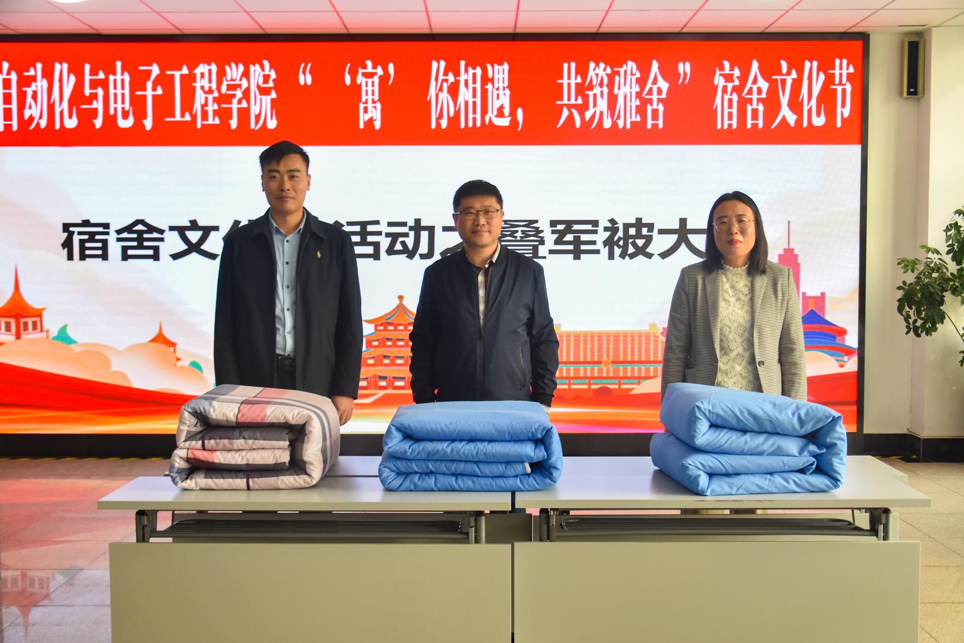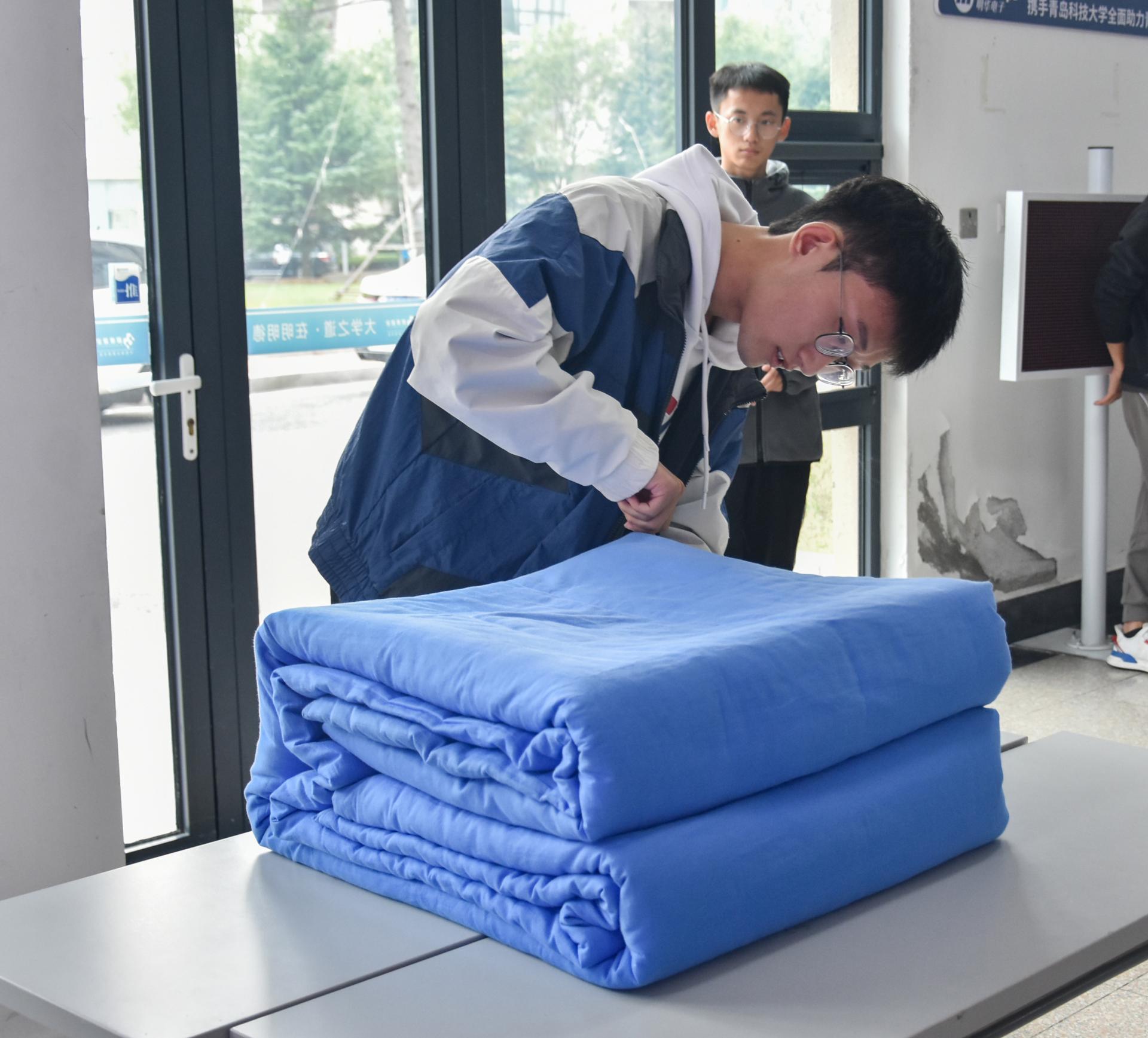 本次叠军被大赛是宿舍文化节的首个活动,比赛伊始,学院五位老师率先上场,给在场同学做示范,翻叠、折角、压线,循序渐进,老师们的军被成品得到评委们的高度肯定。