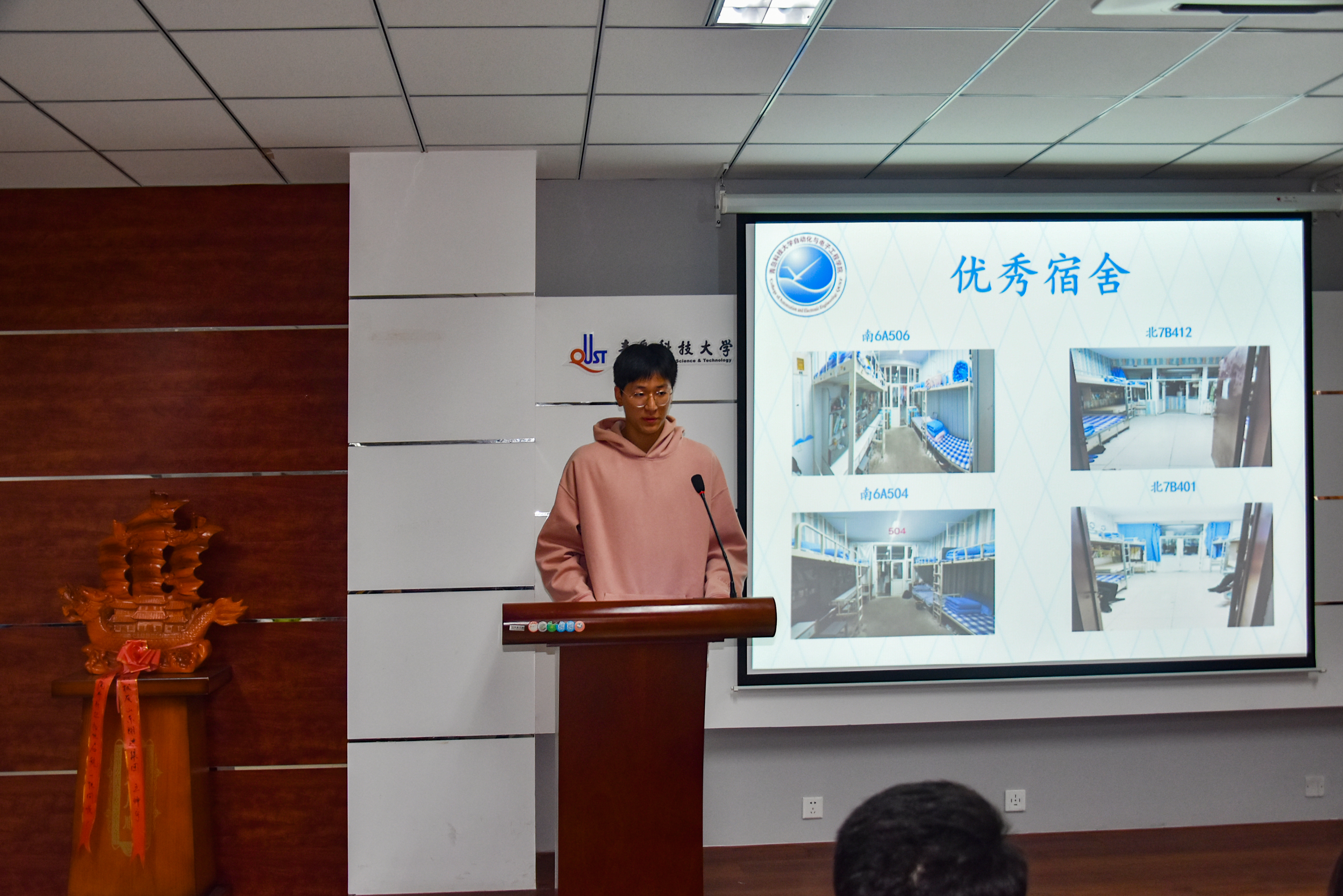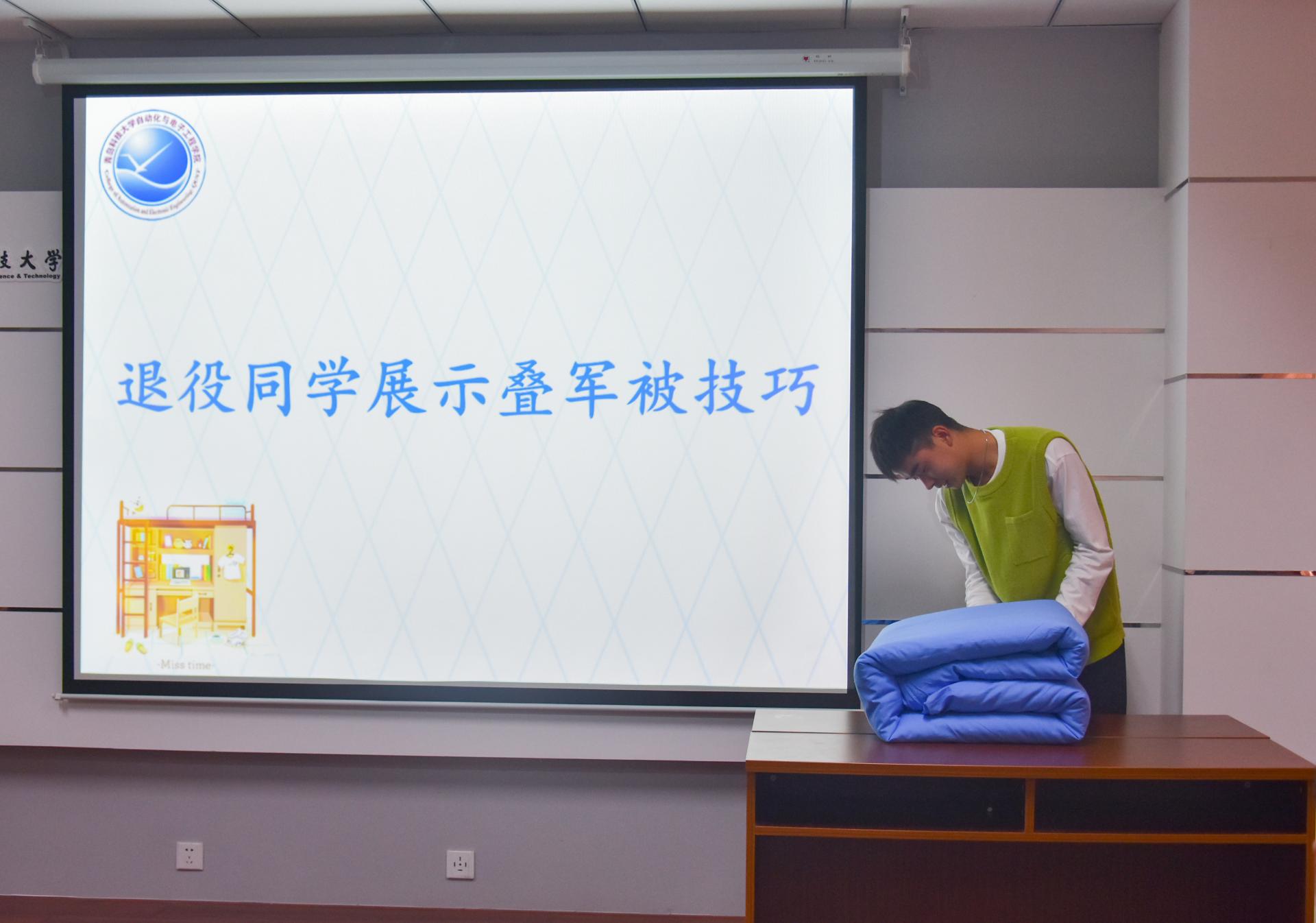 20级优秀舍长王海洋分享心得,与新生们交流宿舍文化建设经验。权益部副部长陈逸青公布前期宿舍检查情况。退伍同学测控211崔清成向大家展示叠军被技巧。