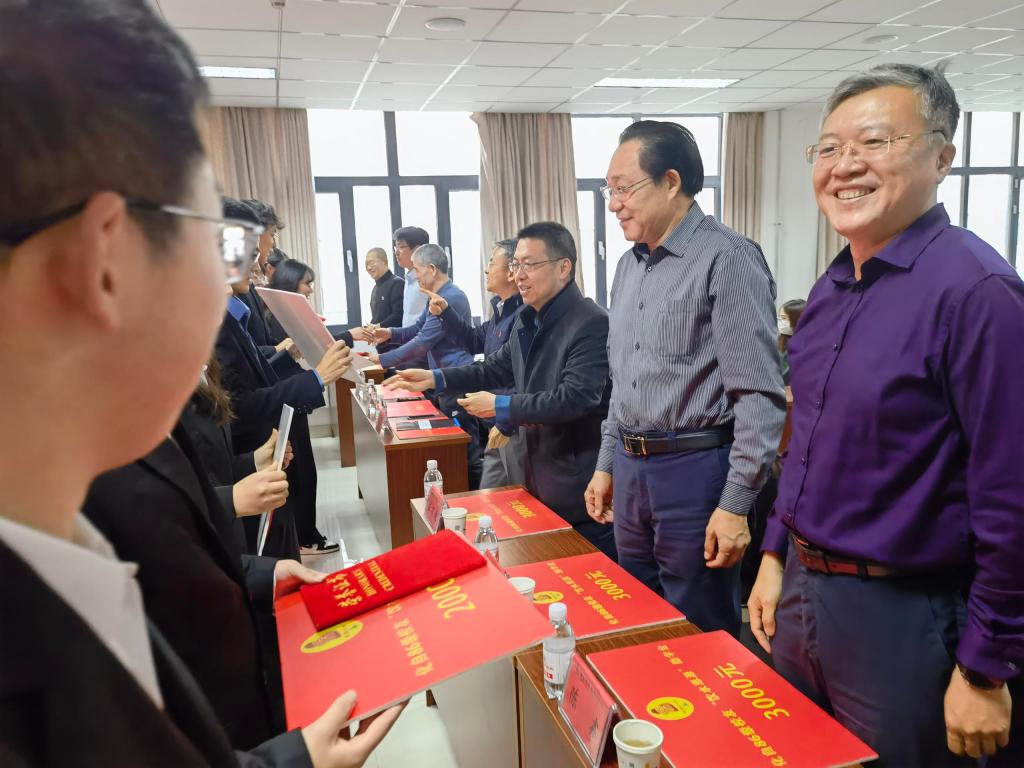 与会领导、化自86校友代表为同学们颁发2021年“饮水思源”奖助学金荣誉证书。