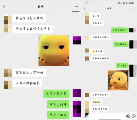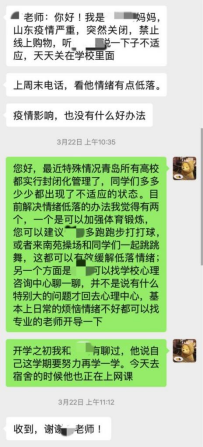 家校沟通“润心”,赢得家长放心。青岛疫情来势汹汹,远在各地的学生家长是最牵挂孩子的人。学院通过微自化公众号发布《致全体学生家长的一封信》,号召学生按时向家里汇报在校的学习生活情况,缓解家长的担忧情绪。辅导员队伍进一步加强家校沟通,主动与学生家长交流讲述学校防控举措及学生近况,提供缓解疫情期间焦虑情绪的方法,引导学生自觉遵守疫情防控有关规定,疏解压力,通过参与文体活动、志愿服务等方式丰富课余生活,让家长迅速知情、放心安心。不少家长通过视频、微信聊天、电话沟通等方式表示对学校抗疫工作的理解和支持,在疫情防控的关键时期,凝聚起家校携手,齐心战“疫”的最大育人合力,切实保障学子们健康、安心度过校园生活。