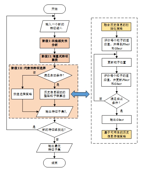 针对流特征选择问题,论文提出了基于动态特征聚类和粒子群优化的流特征选择方法。该方法利用在线相关性分析快速去除不相关特征,初步减少新到达特征组的特征规模;采用增量特征聚类技术将特征组中的冗余特征聚集,缩减后续进化优化算法的搜索空间;基于聚类后的特征空间,利用历史信息驱动的整形粒子群算法搜索最优特征子集。