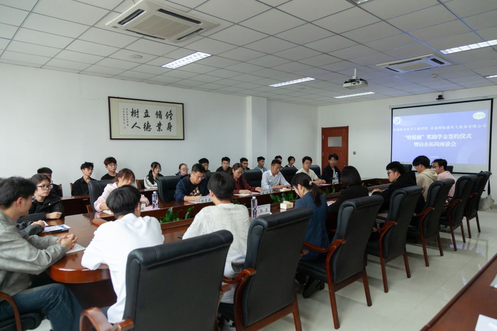 与青岛特锐德电气股份有限公司于学院楼408会议室联合举办了“特锐德”奖助学金签约仪式暨访企拓岗座谈会。青岛特锐德电气股份有限公司人力资源中心总经理韩增雪、人力资源中心人力总经理助理张莹、学院党委书记李卉、学院常务副院长兼机器人学院常务副院长巩敦卫、学院党委副书记兼副院长刘名森出席会议,2025届毕业生辅导员老师张郁浩、赵赪赪,以及首届“特锐德”助学金获奖学生与2025届毕业生代表参加会议。会议由学院党委副书记兼副院长刘名森主持。