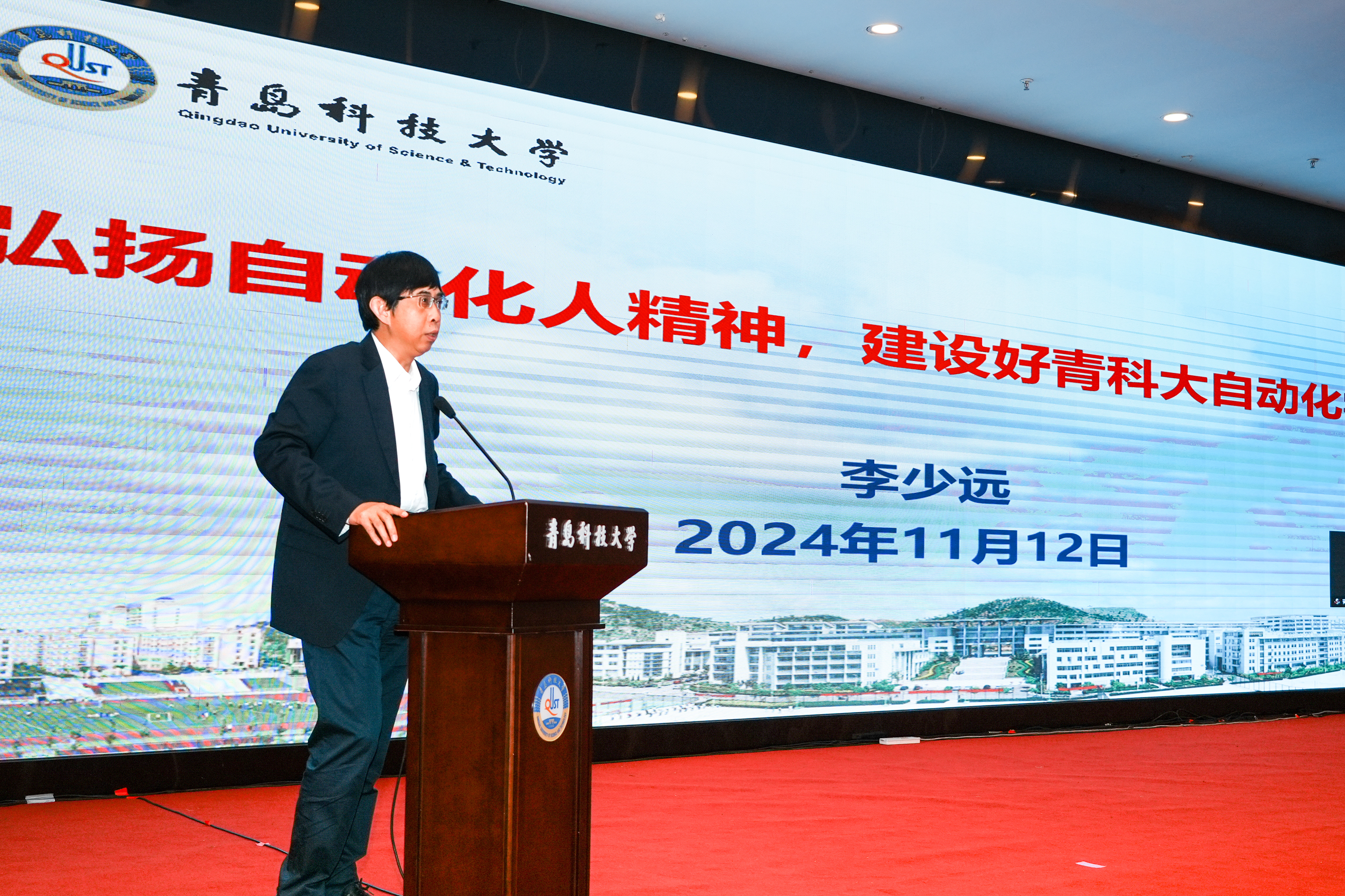 情况,做题为《弘扬自动化人精神,建设好青科大自动化学科》的专题报告。李少远介绍了学院学科基本概况,从研究方向、学科方向、近五年成果、人才培养、服务贡献等方面详尽阐述了学科建设进展情况。他强调,要以高水平控制科学与工程学科博士点建设为牵引,力促学科综合实力显著提升。李少远深刻阐述了自动化人精神的丰富内涵和时代价值,号召全体师生以自动化人精神为指引,不断追求卓越,勇攀科技高峰。