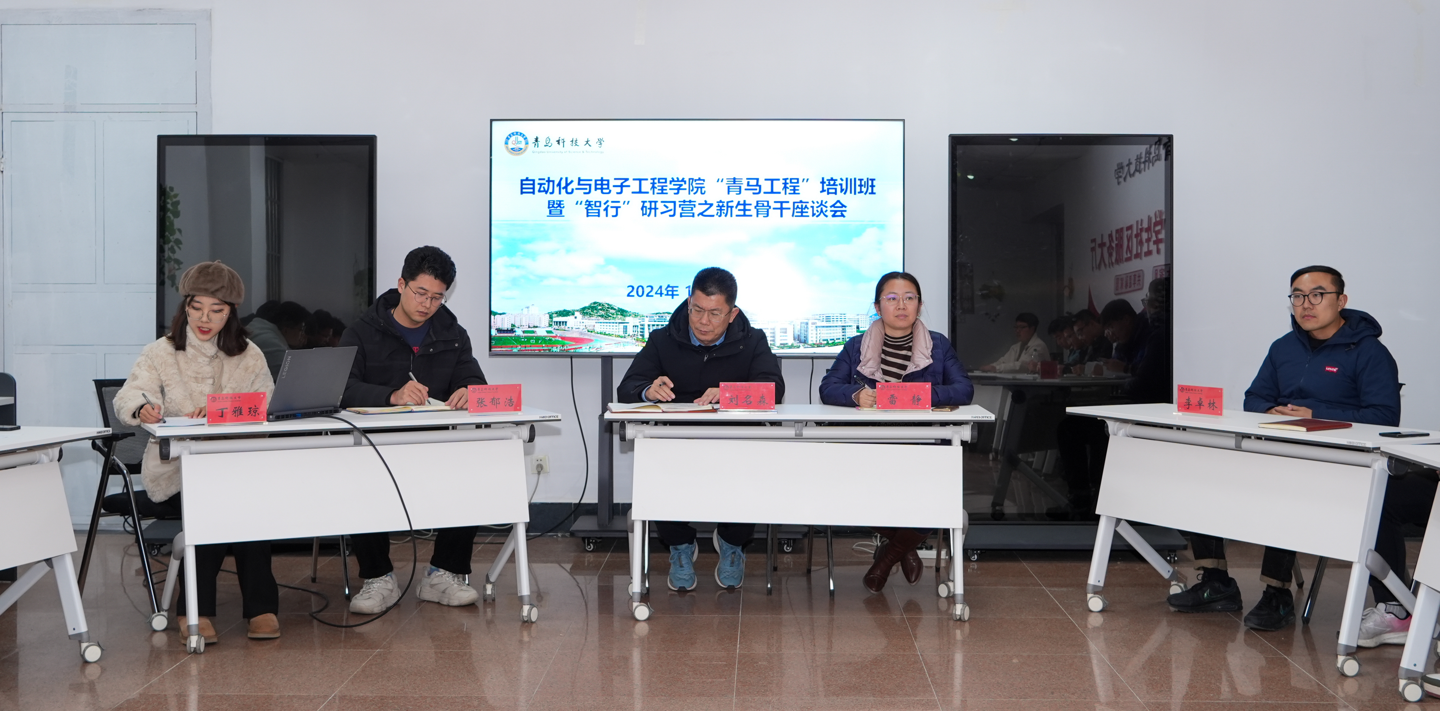 于学校“一站式学生社区”召开了“青马工程”培训班暨“智行”研习营之新生骨干座谈会。学院党委副书记兼副院长刘名森,团委书记兼学工办主任雷静,团委副书记兼学工办副主任张郁浩,团委老师李卓林,2021级、2023级班级骨干代表,2024级各班班长、团支书参加会议,会议由团委老师丁雅琼主持。
