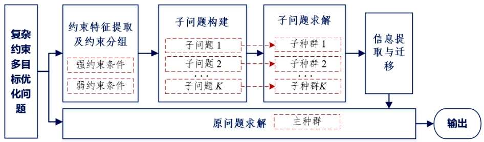 论文针对工业生产广泛存在的复杂约束多目标优化问题,提出了基于约束分组的智能优化算法。该算法将复杂约束分组构建多个子问题,利用进化算法和强化学习融合实现问题的高效求解。首先,基于对约束条件的解析,将约束条件分成若干类,并对强约束和弱约束分组,形成多个约束子集;然后,基于这些约束子集构建多个子问题,并为每个子问题分配独立的种群进行优化;最后,通过信息提取和转移,将子问题优化过程的有效信息传递到原始问题的优化过程,加速原始问题的求解。