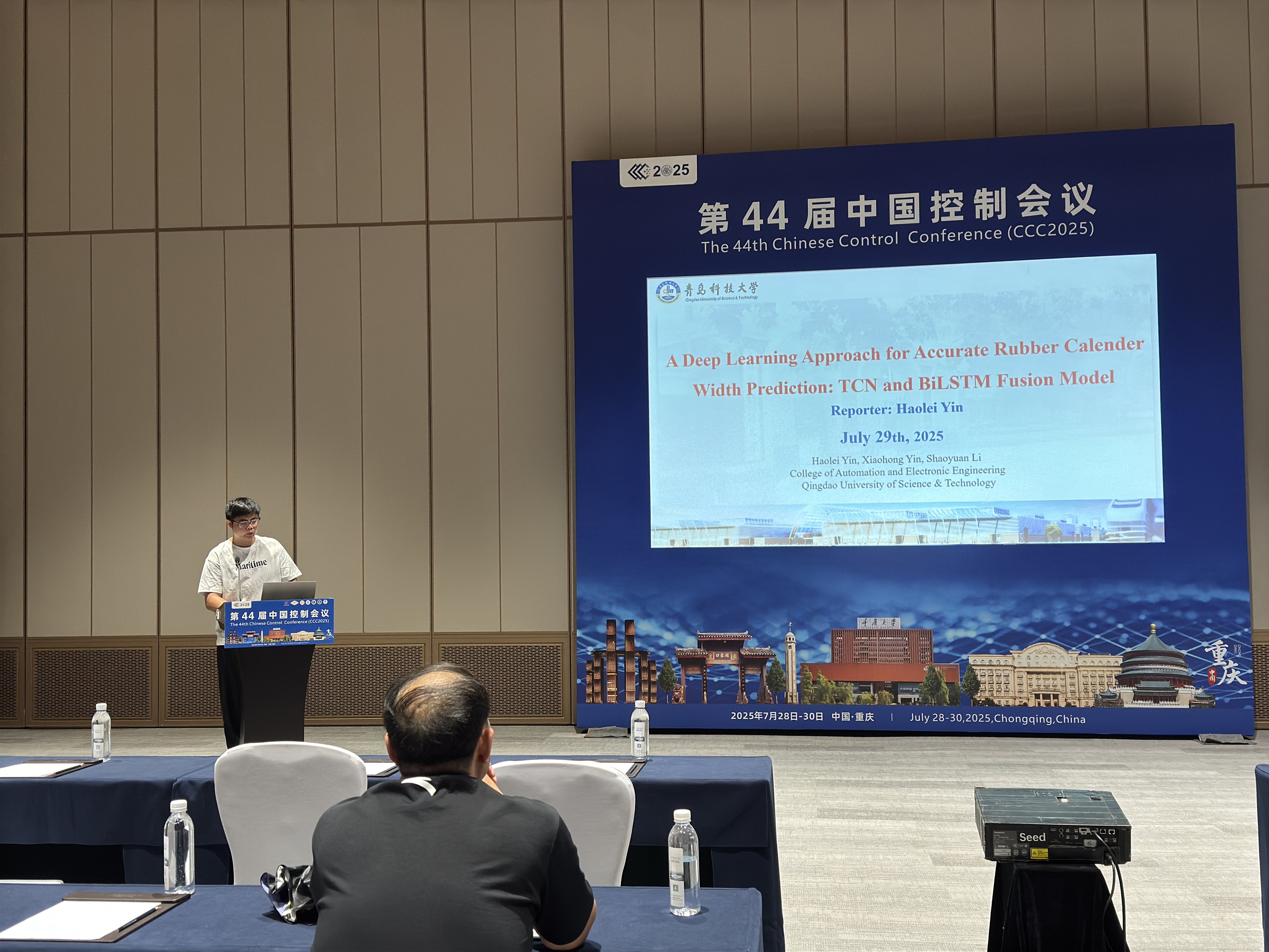 李少远教授现为中国自动化学会特聘顾问,此前担任中国自动化学会副理事长,控制理论专委会副主任等职位,为中国控制会议的发展做出了重要贡献。今年青岛科技大学团队多篇论文被会议录用,带领刘文韬副教授及多名相关研究生参加了此次学术盛会。在分会场中,青岛科技大学的研究生们分别汇报了各自的学术研究成果。研究生尹浩磊作了题为“A Deep Learning Approach for Accurate Rubber Calender Width Prediction: TCN and BiLSTM Fusion Model”的报告。尹浩磊围绕橡胶压延工艺在轮胎生产中的重要性,提出了一种TCN-BiLSTM神经网络架构下橡胶压延系统胶条宽度模型。利用时间卷积网络通过捕捉时间序列中的局部依赖关系来提取时间特征,从而有效应对短期波动和干扰。将提取的时间特征输入双向长短期记忆网络,进一步建模长期依赖关系和复杂动态特性。利用过去和未来时间步的信息来建立耦合关系,实现跨不同时间尺度的全面时间特征提取,增强模型的预测和解释能力。