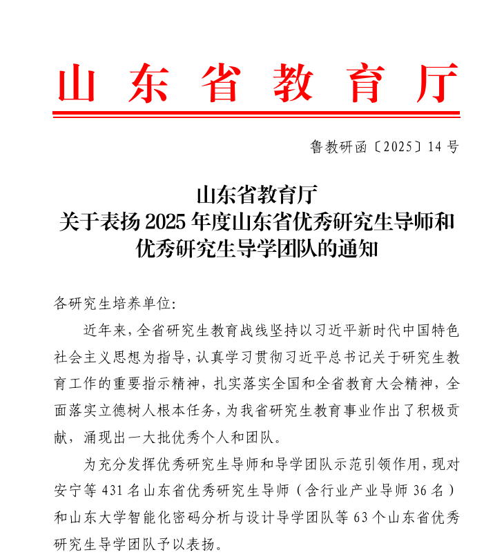 近日,山东省教育厅发布了《山东省教育厅关于表扬2025年度山东省优秀研究生导师和优秀研究生导学团队的通知》(鲁教研函〔2025〕14 号),我院籍艳、张方坤两名教师获评山东省优秀研究生导师。