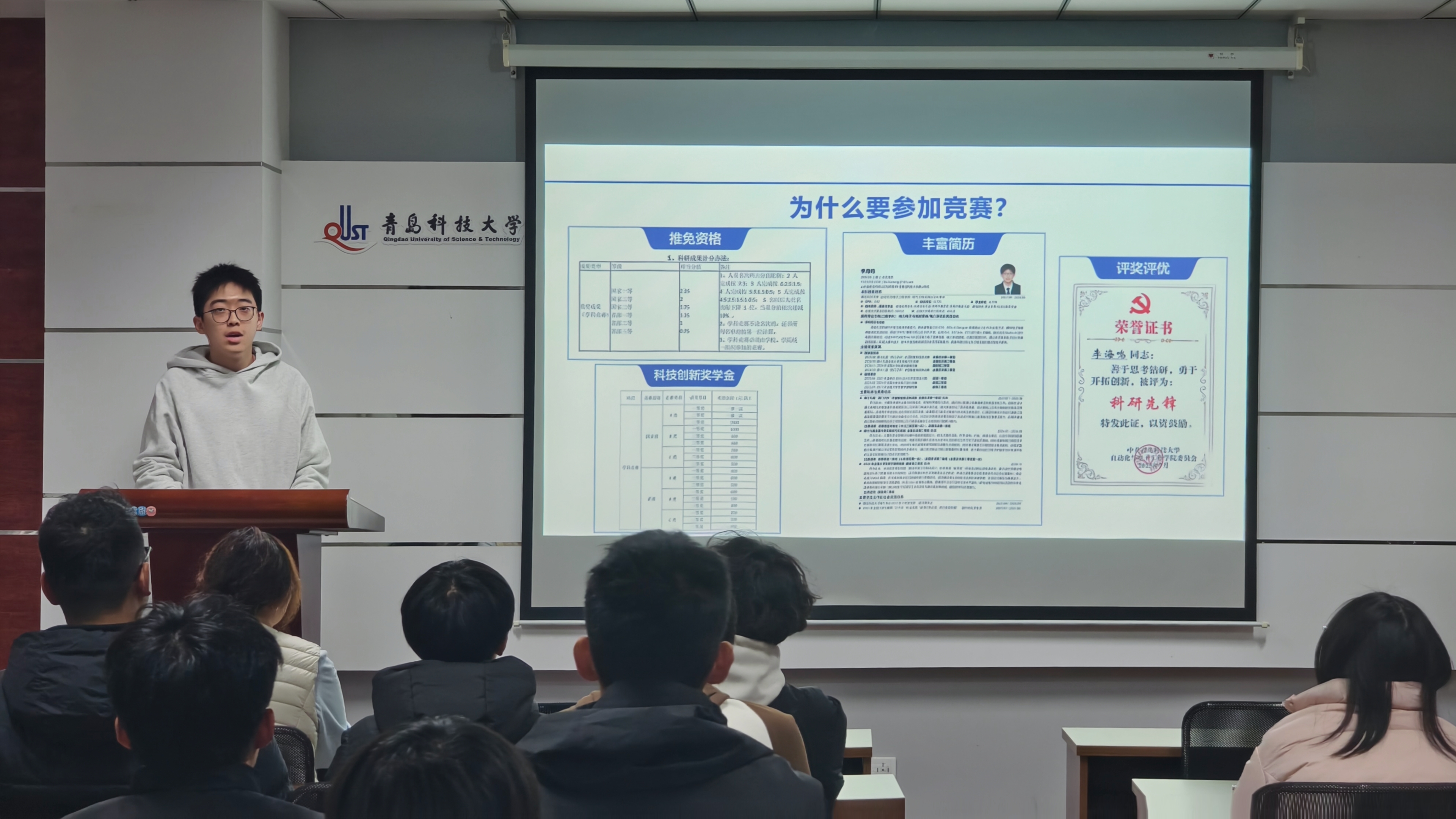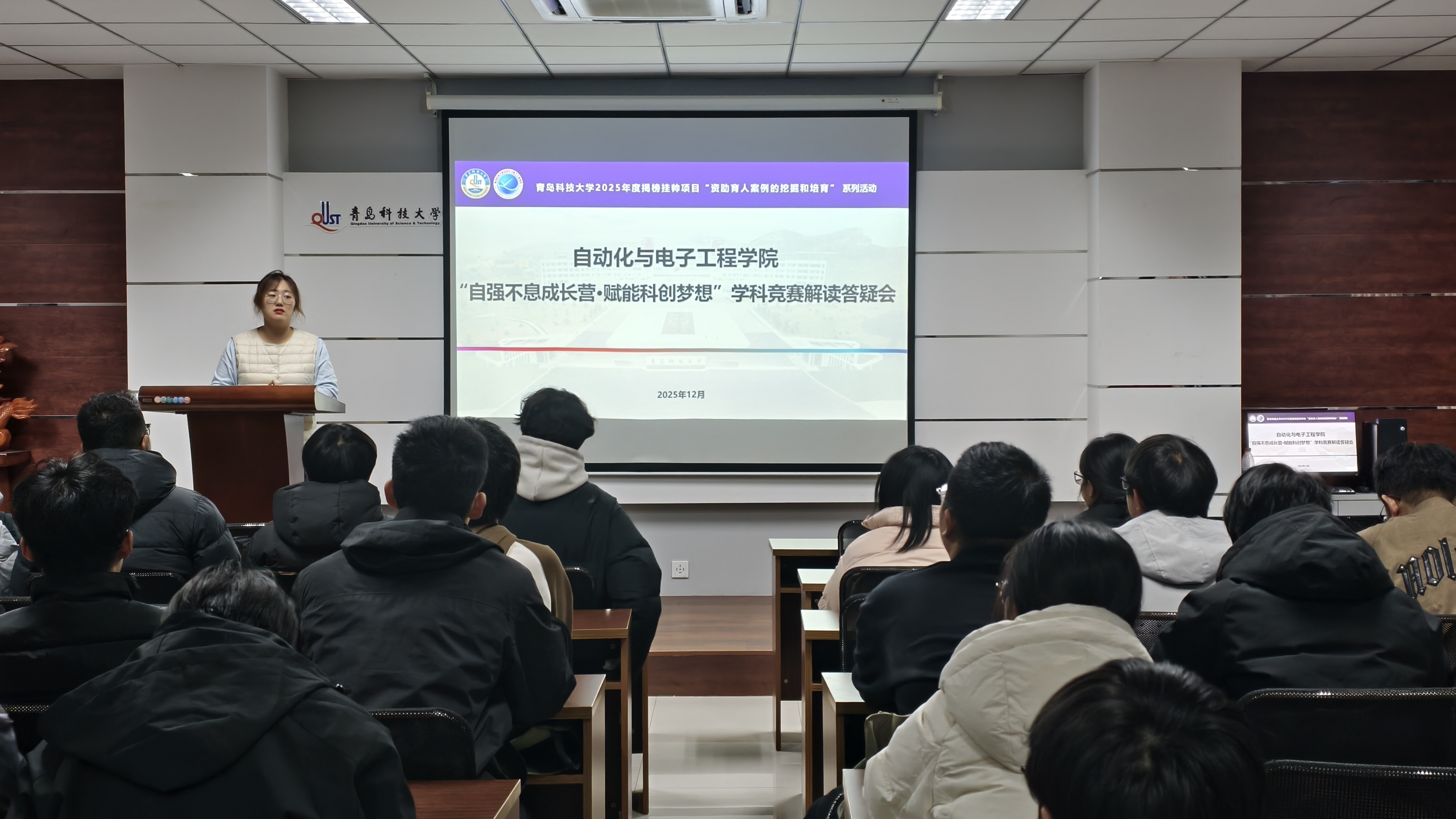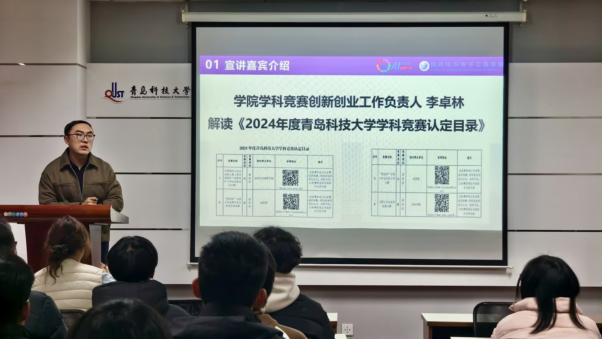 活动伊始,学院学科竞赛与创新创业工作负责人李卓林结合《2024年度青岛科技大学学科竞赛认定目录》,系统梳理赛事申报条件、时间节点及赛事主题,重点剖析自动化领域重点赛事的学科导向与能力要求。针对困难生群体“赛事认知模糊、参与信心不足”等痛点,李卓林以学院学子“以赛促学、以赛成才”的典型案例为支撑,鼓励同学们破除心理障碍,精准匹配自身专业优势选择参赛方向。