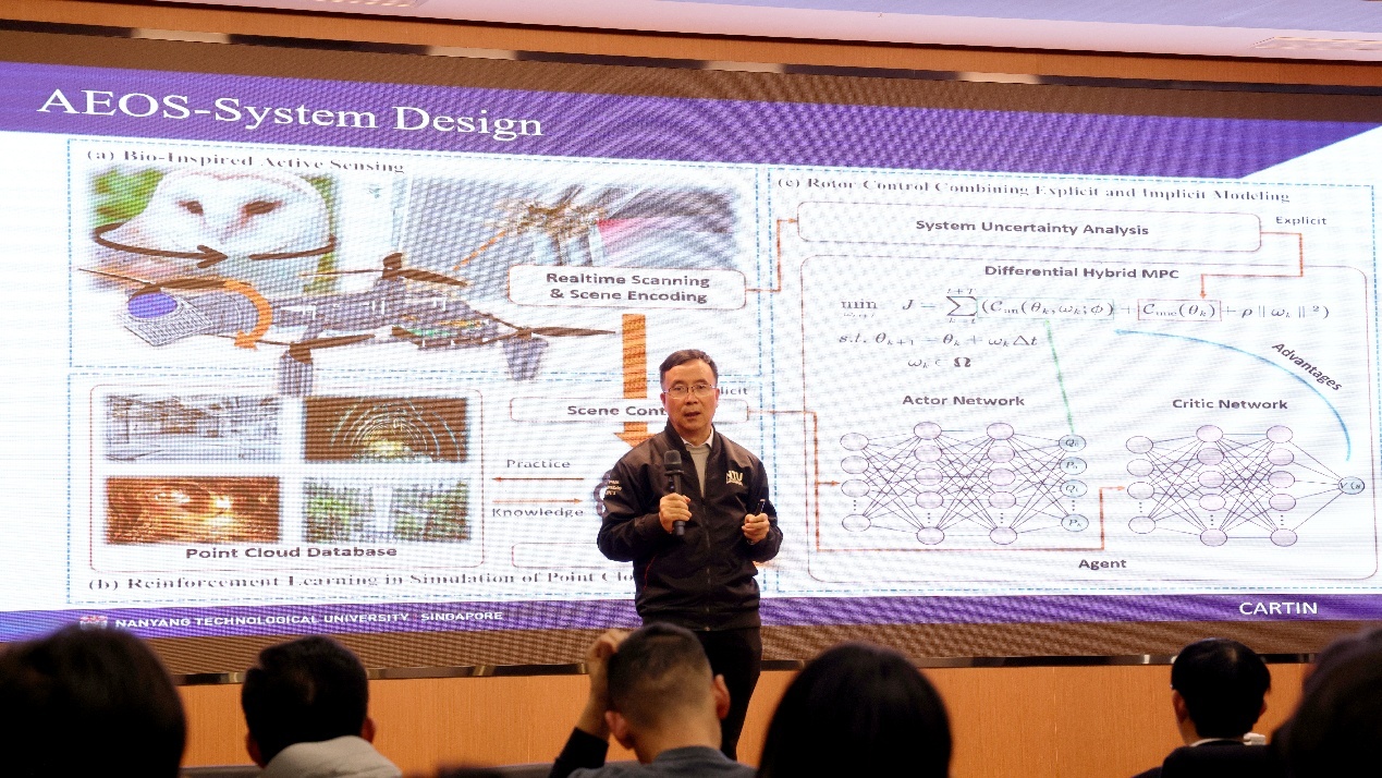 谢立华教授作了题为《Recent Advanced in Perception and Navigation for Unmanned Systems》的专题讲座。报告以无人系统的工程闭环为主线,围绕“感知-规划-协同控制”三大关键环节展开系统阐述:在感知层面,重点介绍复杂环境下多源信息获取与融合、目标识别与定位估计等核心技术,强调以鲁棒性与可信度提升支撑后续决策;在规划层面,围绕任务目标分解、约束建模与在线重规划等内容,阐释如何在安全、效率与实时性之间实现可计算、可验证的策略生成;在协同控制层面,聚焦多无人平台协同作业需求,讨论队形保持、任务分配与分布式一致性控制等关键问题,提出在通信受限与不确定扰动条件下提升群体系统稳定性与协同效率的思路与方法。报告结束后,谢立华与现场师生进行了交流讨论,就无人系统在复杂场景应用、算法与系统集成、工程落地路径等问题进行了深入互动。