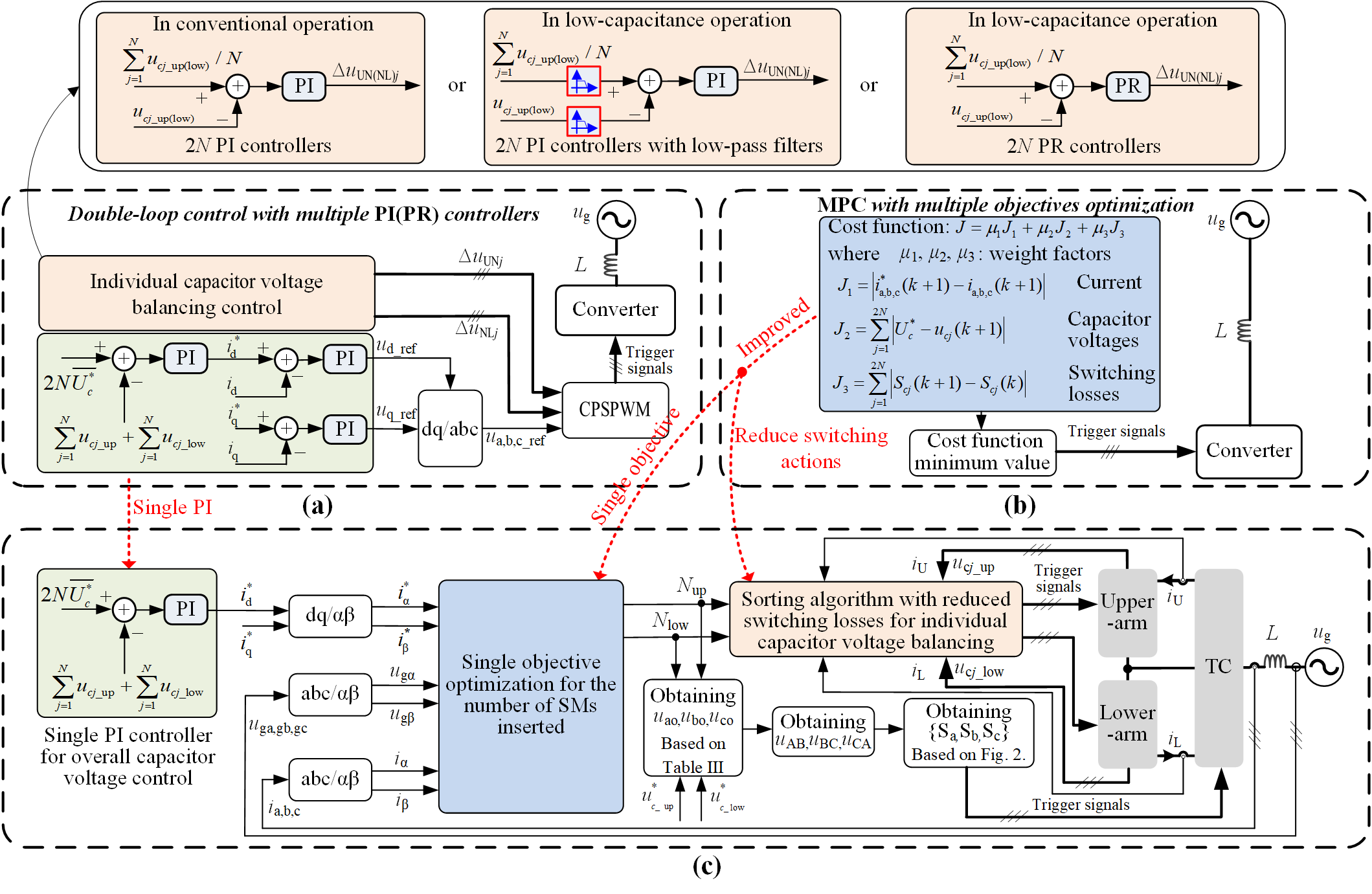 图1控制策略比较示意图(a)基于多PI(PR)控制器的双闭环控制,(b)基于多目标优化的模型预测控制,(c)本文提出的分层控制