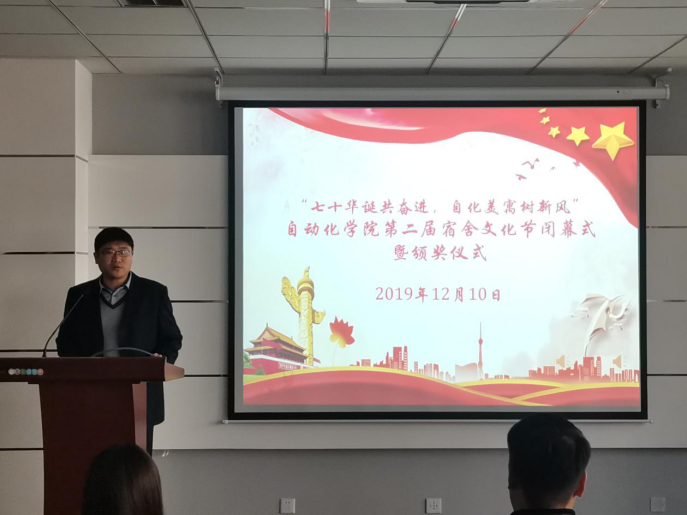 于彬和吴擎分别颁发“十佳舍长”与“宿舍装扮大赛”奖状。测控194班王壹正同学作为十佳舍长的代表上台发言,阐述了自己对舍长责任以及宿舍氛围对同学影响的理解。