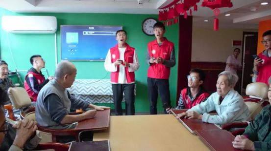 兴致之余,在义工队董天宇同学和张永健同学的领唱下,志愿者和老人们合唱《我和我的祖国》,歌声虽不像百灵鸟般美妙,但却如麻雀般淳朴。唱完后,大家不尽兴,又唱了《映山红》、《送别》、《团结就是力量》等老人们年轻时的歌曲。最后,“合唱环节”在《青岛科技大学校歌》的旋律中结束。