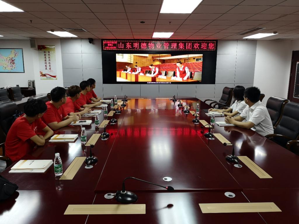 在山东明德物业管理集团有限公司总部,董事长秘书刘通带领我们进行了参观学习。明德集团将传统物业服务企业向“数字化、专业化、标准化、机械化”为核心的“四化”转变,打造成制定行业标准的标杆型企业,引领智慧物业行业发展。