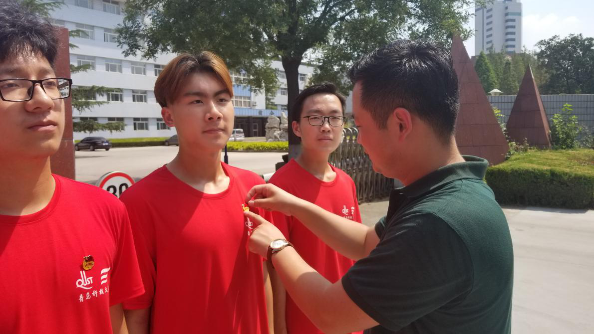 7月20日上午,青岛科技大学赴齐鲁石化“新旧动能转换”调研团在指导老师刘海波的带领下到达齐鲁石化研究院,在齐鲁石化研究院门前刘海波为调研团队员举行佩戴团徽仪式。