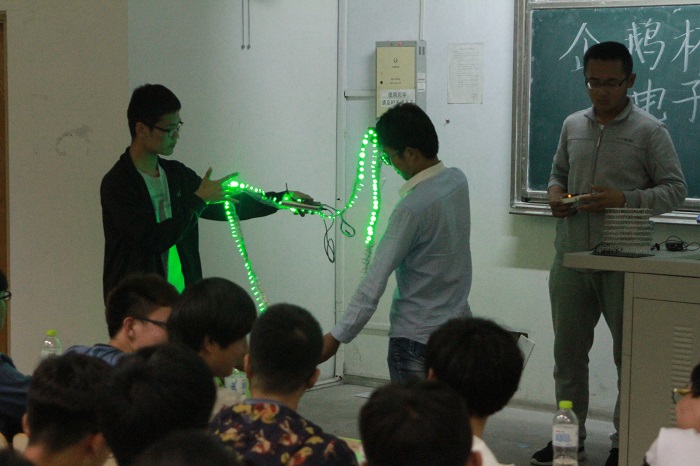 本次比赛主要面向2015级全体同学,同时鼓励同学们邀请2014级学长、学姐进行传帮带组队,意在挖掘和选拔自动化科技创新达人,为学校“校长杯”工业自动化挑战赛,及其各分赛事电子设计竞赛、麦科杯工业自动化挑战赛、智能汽车竞赛和“挑战杯”大学生科技作品竞赛等各赛事选拔储备人才。参赛队员经过前期的培训和指导,从采购单片机处理器,购买电阻、电容开始,一步步搭建、焊接和调试,最终开发出专属自己团队的科技创新作品。比赛现场,各队都完成了实物作品的制作,并进行了现场展示。尤其“智能浇花装置”、“蓝牙自动控制小车”“3D光电跟踪头”和“温湿度测试仪”等作品,设计者善于观察生活,产品源于生活、服务于生活;经过评委打分和现场观众的大众分数,最终5号团队的作品“点滴计时器”获得了此次比赛的一等奖,评委为获奖者颁发证书和奖品。