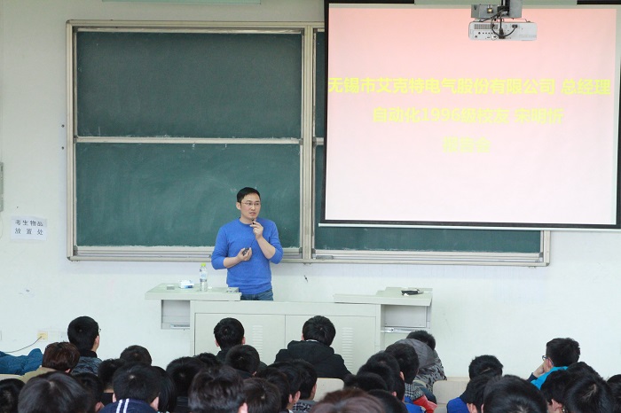 报告会上,无锡市艾克特电气股份有限公司经理、自动化96级校友宋明忻通过讲述自身的创业成功经历,与自化师生分享了其在创业中如何做人、如何做事、如何圆梦。其中,他提及校园招聘,鼓励同学们积极参加大学生科技创新大赛,激励同学们做好人生规划,精彩的励志报告,引起了师生的共鸣,现场暴发出阵阵热烈的掌声,激发出学生更高的学习热情、更加坚定的信心和成才的动力。报告会尾声临近,宋明忻先生与学生互动交流,尽显对同学们的肯定;同学们积极回应,倍受启发和鼓舞。