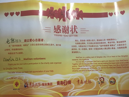 天气虽微凉,但同学们一早准时就在台东三路麦当劳集合完毕,个个精神抖擞,蓄势待发。同学们按照提前分好的小组,于胸前贴好“微尘”的爱心标签,手拿“爱心报”,兴致勃勃的开始了义卖活动。同学们积极努力、不怕失败,即使被婉言谢绝也仍然面带微笑毫不气馁地继续努力着,更有“不怕苦不喊累”的精神,走遍大街小巷努力义卖着。各小组之间无形中似乎也形成了一种“竞争”模式,彼此都争先恐后,使出浑身解数进行义卖,为此次义卖活动增添了不少的乐趣。经过了两个半小时的义卖后,虽然同学们满头大汗,但都乐在其中。义卖结束后,同学们先后返回集合地点,同时将本次义卖的钱全部投入捐款箱中。经过同学们的不懈努力,每个小组全都“果实”丰硕,各位成员也都获得了“微尘”活动的感谢状,其中,第二小组三人更是以骄人的“战绩”荣获了本次活动“义卖冠军”的称号。最终,在同学们的欢声笑语中,本次活动正式划上了一个圆满的句号。