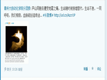 分团委及学生会发起的“祈福雅安,传递爱心”——微博转发活动有序的展开。同学们以微博为平台,通过各种各样的手段与方式抒发着内心对雅安同胞的关怀与对遇难者的哀思。