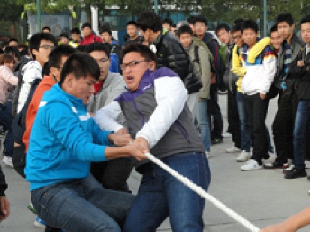 比赛前,运动员们的神经就像比赛的绳子一样,绷得紧紧的。旁边的啦啦队也精神抖擞。随着裁判哨子的吹响,运动员们突然发力,男生个个都涨得面红耳赤,青筋爆粗;女生也毫不示弱,放下了平时的淑女风范,使尽浑身力气,不顾一切地往后拉。比赛的过程中虽然天空很晴朗,但却刮来了强劲的寒风,辅导员王伟老师、张敏老师顶着凛凛的寒风,亲自来到现场为同学们加油打气,和同学们一起感受活动中的温暖与快乐。各班啦啦队热情高涨,为自己班加油助威。加油声,呐喊声此起彼伏,震耳欲聋,飘荡在整个操场。比赛历时3天,经过多场鏖战,最终,于