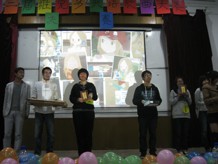 学生会副主席孙宏伟,维克多现任会长石新鹏和上届英文歌曲大赛冠军任康桥。比赛还邀请了个兄弟学院社管委主席等作为嘉宾。进入决赛的八位选手分为三组,另外小组赛之间还有观众互动环节——猜歌名游戏,充分调动了全场的气氛,连现任会长石新鹏也忍不住唱了几首。参赛选手给观众带来了太多的惊喜,尤其是3号选手王金秋用地道的美式音劲爆全场,最后以9.7分的绝对优势获得一等奖。7号张乃川获得二等奖,1号杨沛沛获得三等奖。李祺、李雁华、邓垚垚和范语婷分别获得最佳表现奖,候向楠和刘伟获得最佳人气奖。至此,维克多英语协会英文歌曲比赛圆满结束。