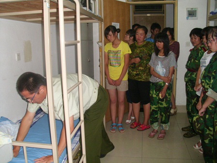 晚上8点40,各部门负责人在22号宿舍楼下集合,由学生会主席张锐分配各部门任务,并将所有人分为两组,一组去女生宿舍,另一组去男生宿舍。9点,负责人带领干事以及大二叠军被好的同学认真的教新生整理内务,床铺床单整洁干净,被子叠成方块状;桌面物品要摆放整齐,桌下放暖瓶,等等。然后,向新生介绍学生会的工作流程和纳新情况,大一同学都表现出了很浓厚的兴趣,并表示想要加入学生会锻炼自己。最后,主席张锐嘱咐同学们注意身体健康,以防中暑,注意财产安全,并祝福大一同学能有一段快乐而难忘的军训生活。