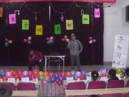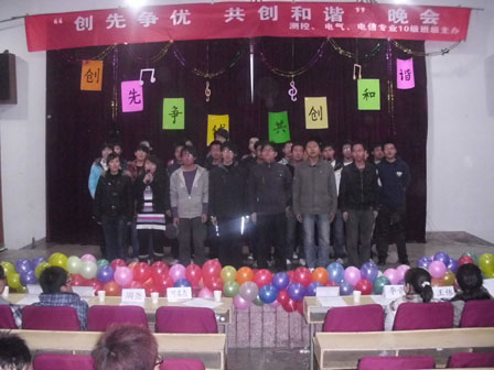 晚上7:00,联谊晚会正式开始。首先,在主持人的宣布下,此次晚会的序幕缓缓拉开。一部记录八个班各自特色活动的幻灯片在温馨的背景音乐中慢慢放映着,使观众了解了八个班级的概况。接下来,一场充满激情与活力的复古舞给观众带来了视觉的冲击。那洋溢着青春热血的舞姿,折射出了青年学子身上特有的气息。虽名为复古,却不乏现代的潮流,将同学们积极向上的心态表现得淋漓尽致。优美的歌曲是每场晚会不可缺少的节目,紧随舞蹈之后的是歌曲表演。穿着华丽的同学们丝毫不亚于专业的演员,他们的歌声带动了现场气氛,观众们也随之打着节拍,不禁一起唱起来。如果说舞蹈歌曲是每场演出是必不可少的,那么紧接下来的相声、小品则让人眼前一亮,相声《倒霉事》、小品《水浒外传》和《推销》让观众捧腹大笑。而且,本次联谊晚会还有一个“特别节目”——八个班的班长向王伟老师致敬,借这个机会,同学们向辛勤劳苦的老师表达了自己最真挚的祝福。最后,此次晚会在大合唱《明天会更好》中缓缓落幕。
