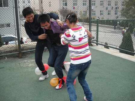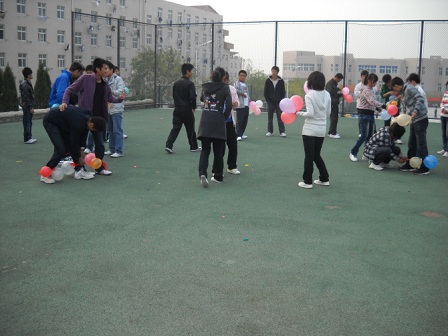 下午两点全体同学准时在操场集合,全班分为六组,每组五人,四男一女。每组中的男生两人一对,用布条绑住相邻的两只脚,最后为两人三足。每一对在布条上绑五个气球。气球中还有奖罚纸条。本游戏为对抗游戏,由女生负责攻击对方的气球,男生防守本方气球,游戏以一方气球全爆为结束。游戏过程激烈精彩,女生放下淑女本色,对男生脚下的气球穷追不舍。男生花样百出,原地转圈儿,两人奋力保护本方气球。更为有趣的是奖罚环节,罚输的一方男女同学对视三十秒,对唱,并说出我班最帅男生的名字,奖励赢的一方同学一个苹果等。最后,在一片欢声笑语中,活动落下了帷幕。