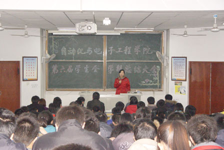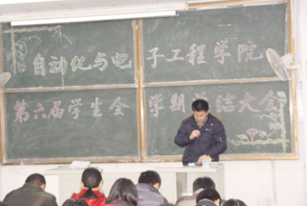 下午2点,大会在主持人杨柳青的宣布下正式开始。首先,主持人通过PPT的形式对本学期学生会的各项活动进行了介绍,使大家对本学期学生会的活动情况有了更加直观的了解。随后,学生会主席李金龙同学对本学期学生会的工作情况进行了总结。而后,刘名森老师宣布了十佳干事名单,并由分团委老师为他们颁发“十佳干事”证书。接着,分团委书记曲斌艳对本学期学生会干事的工作情况进行了点评,指出本届学生会干事综合素质较高,工作积极主动,举办的活动想法新颖、有特色。同时,她对学生会成员提出了几点建议和要求:第一:处理好学习与工作的关系,做好期末考前复习,诚实应考,争获优良考风学院。第二:学生会骨干要充分利用好假期时间,挖掘自身潜力,为下学期工作做好准备。第三:学生会干事要拓展思想、开阔视野,多举办与学生专业、工作等密切相关的特色活动。最后,她预祝学生会干事期末考试取得优异成绩,下学期工作有骄人表现。大会在热烈的掌声下落下帷幕。
