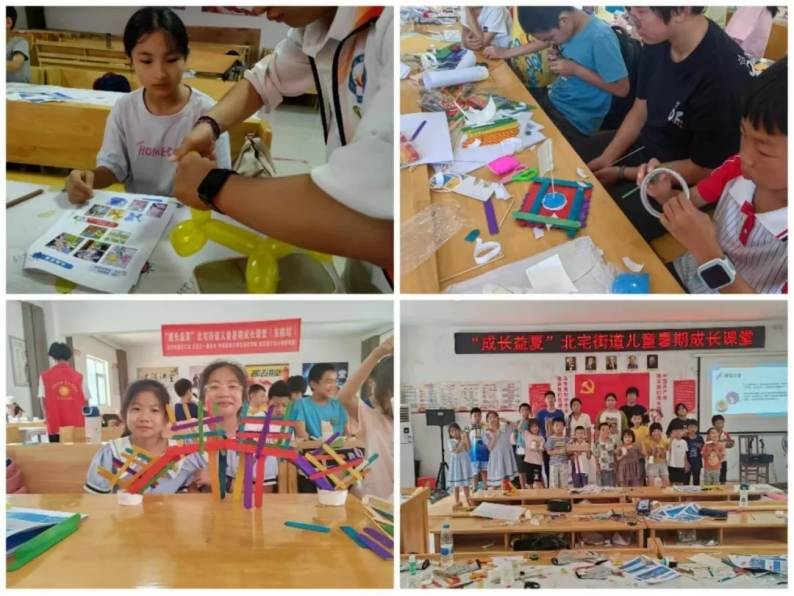 志愿者们与社工合作将科普与手工结合,设计了多样的手工实践活动。在志愿者的引导参与下,孩子们在“气球变形记”活动中制作了各式各样的气球作品,美丽的花朵,可爱的小狗从他们的手中创造出来;在“形形色色的交通工具”活动中,他们用卡纸、木棍、胶水等工具设计并制作了坦克、太空飞船等模型,在挥洒天马行空的想象力的过程中,潜移默化的提高了孩子们的团队协作能力和创新创造能力。