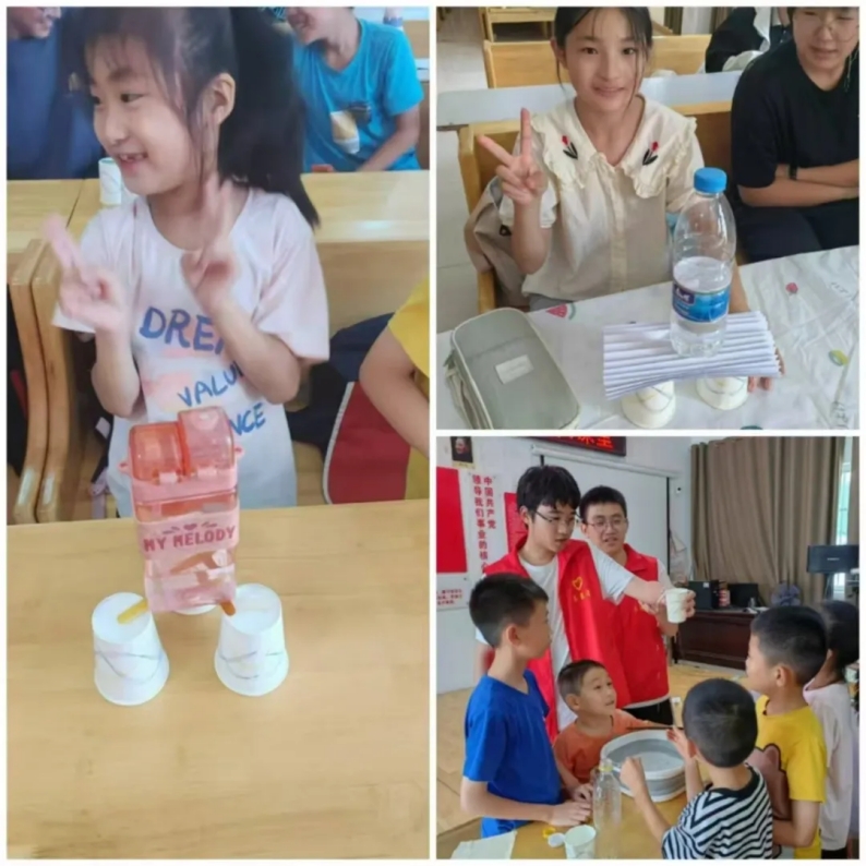 志愿者们还组织了趣味物理实验小课堂。与孩子们共同开启了梦幻的科学之旅,在悬空桥实验中志愿者讲解了增加领域面积法则、构造强度理论等原理,制作了悬空桥,三根雪糕棍支撑起了重物,孩子们在喜悦与实践学到了知识;在虹吸现象实验中,志愿者在同学们看到神奇的现象产生的发问后耐心讲解,使得孩子们加深了对于大气压强的了解;在A4纸承重实验中,对折弯曲的卡纸支撑起了一瓶水,孩子们在一声声惊叹中对力学和压强的基本概念有了初步认识。一个个的实验现象不仅能够使孩子们直观地理解抽象的科学概念,更让科学的种子在他们心中生根发芽。