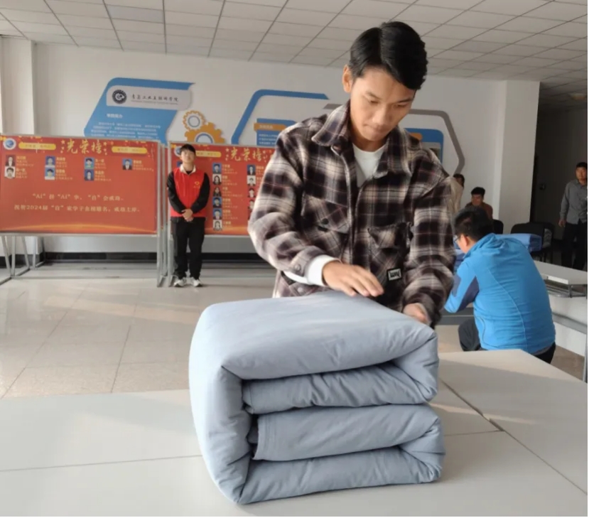 比赛前,军协裁判人员宣读比赛规则,由退役士兵大学生现场为同学们演绎标准的军被叠法,通过“压,折,抠、捏”等精湛手法,将褶皱的被子精心塑造成一块四角挺括、线条流畅的“豆腐块”,为参赛者们树立了军被折叠的典范,激发了选手们的竞技精神,点燃了整个赛场的火热氛围。