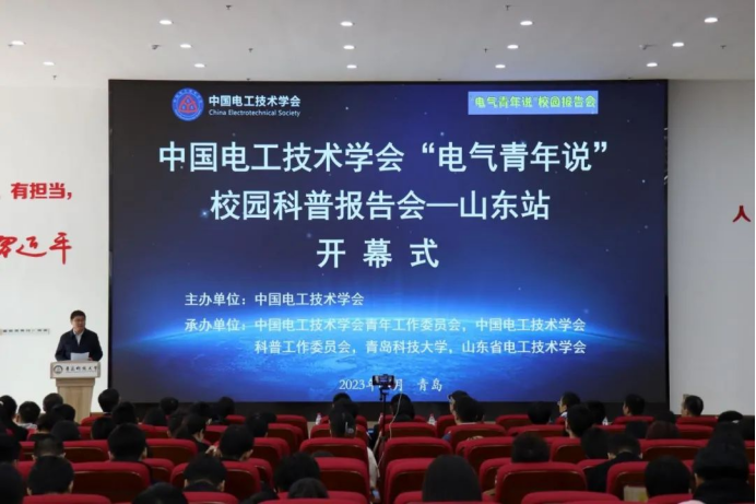会议邀请山东大学张云鹏副教授、山东理工大学李秀峰副教授、青岛大学徐冠华助理教授、国网青岛供电公司许志亮高工以及青科大李国倡副教授共5位优秀电气工作者作科普报告。付艳东、程新功分别代表中国电工技术学会和省电工技术学会致辞,并为报告专家颁发中国电工技术学会科普专家聘书。