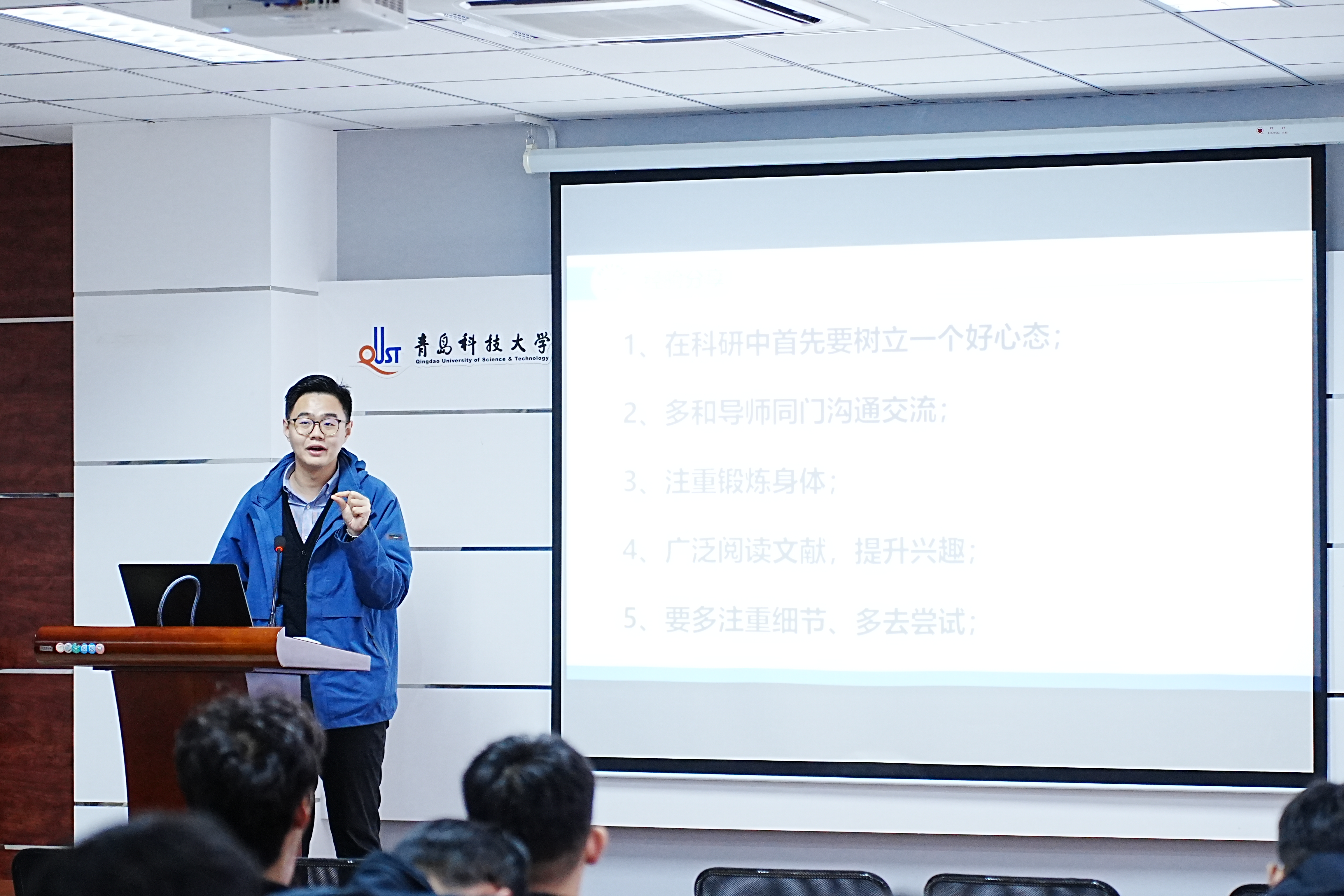 张益宁从科研与学生工作两个方面进行分享,依次讲述研究生生涯中论文发表、竞赛参与和专利发明的重要性。他提醒大家在科研中首先要树立一个良好的心态,多和导师以及同门进行沟通,广泛阅读文献,培养好习惯。